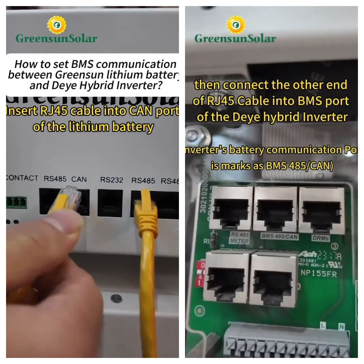 1. Insert RJ45 cable into CAN port of the lithium battery,and then connect the other end of RJ45 cable into BMS port of the Deye hybrid inverter.
